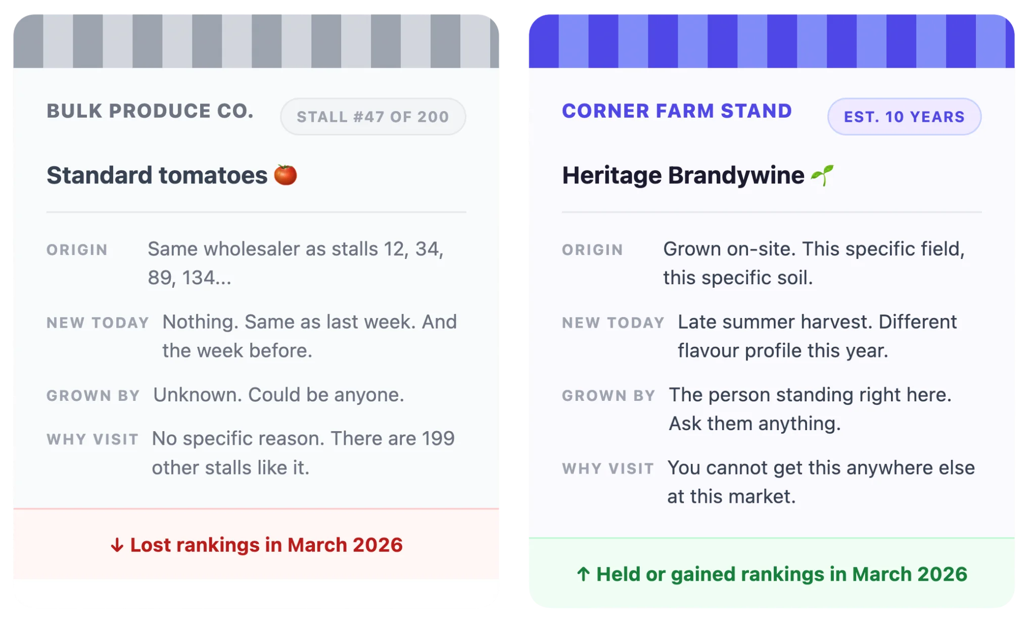 This changes the competitive landscape directly. A small business with genuine expertise in a specific niche now has a page that can compete with a much larger site's page, if the content is demonstrably more original and better informed. The market manager is not only looking at the size of the operation. She is looking at what is actually on the stall.