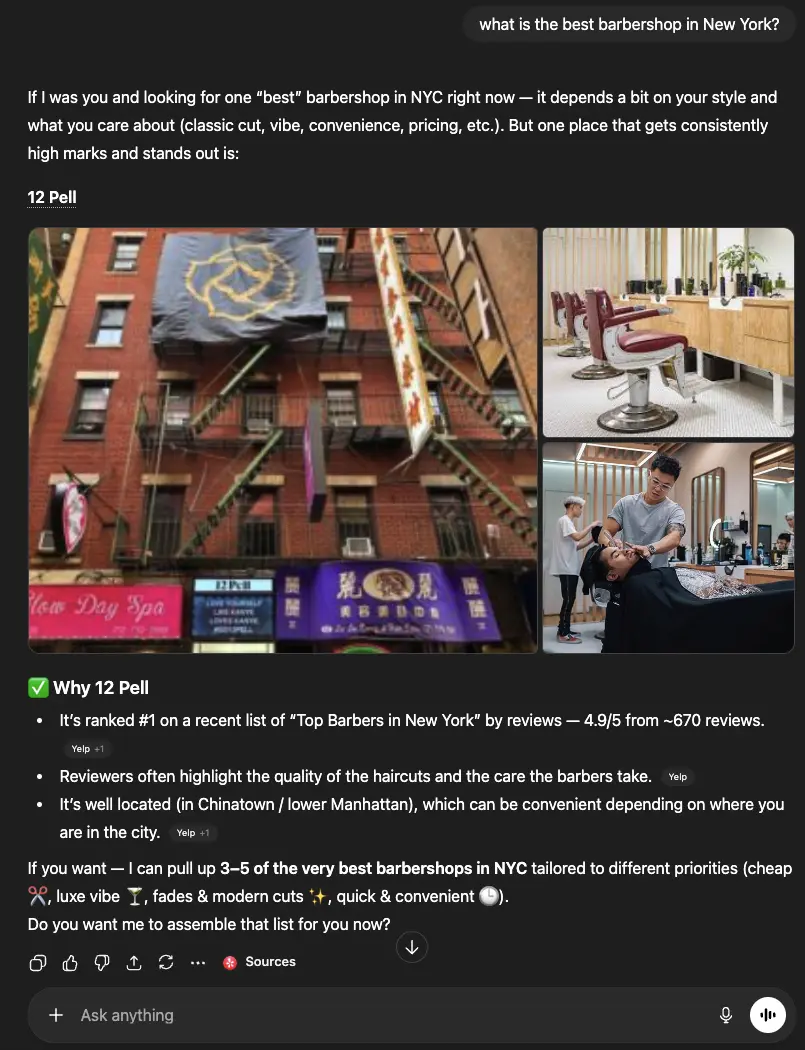 If we ask ChatGPT the same question, it produces a different answer — one that does not directly match Google’s top results. That’s because AI assistants do not “pull” ranked links; they infer what business best matches the intent by evaluating broader contextual signals, reputation across the web, and how consistently that business appears as a trusted entity.