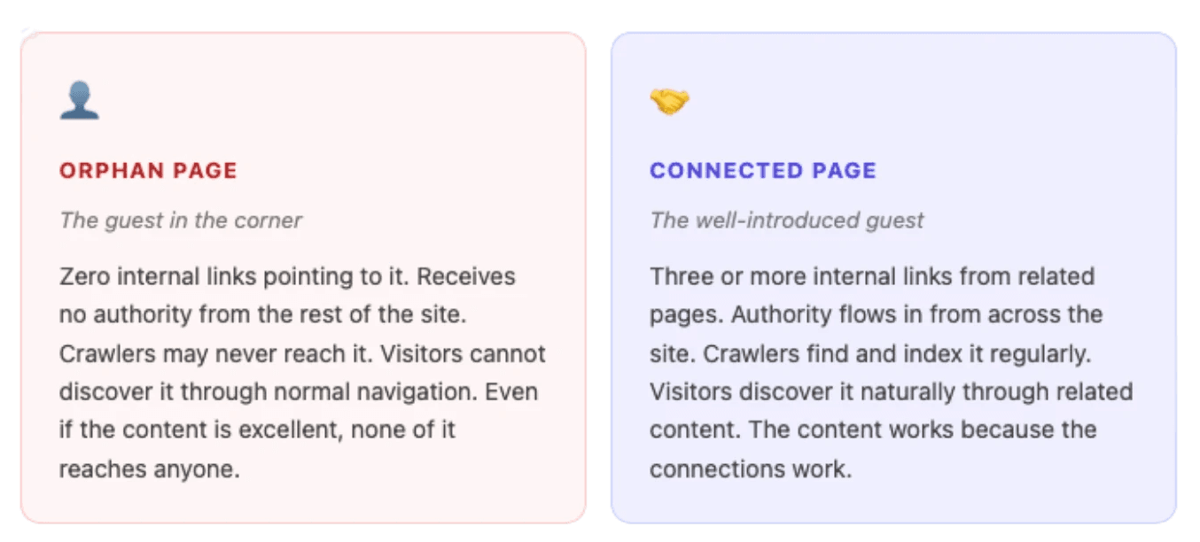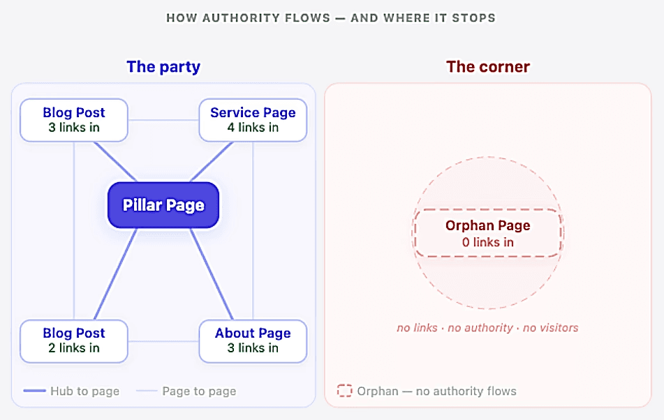 That person is your orphan page. It exists. It might even be genuinely useful. But with no internal links pointing to it, it stands in the corner of your website while everything that matters happens elsewhere.
