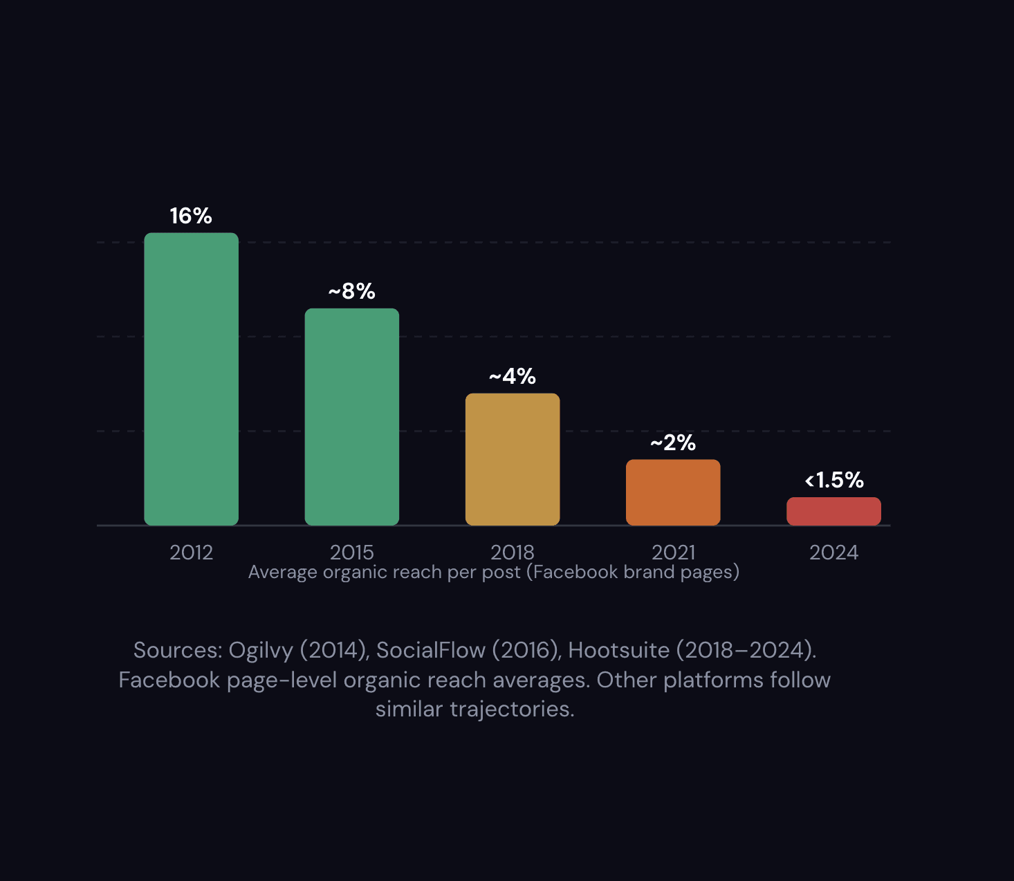 Between 2012 and 2024, average organic reach on major social platforms fell from 16% to under 1.5%. For a decade, brands got free brand-building through organic content — regular touchpoints that kept them visible, familiar, and top-of-mind. That era is over.